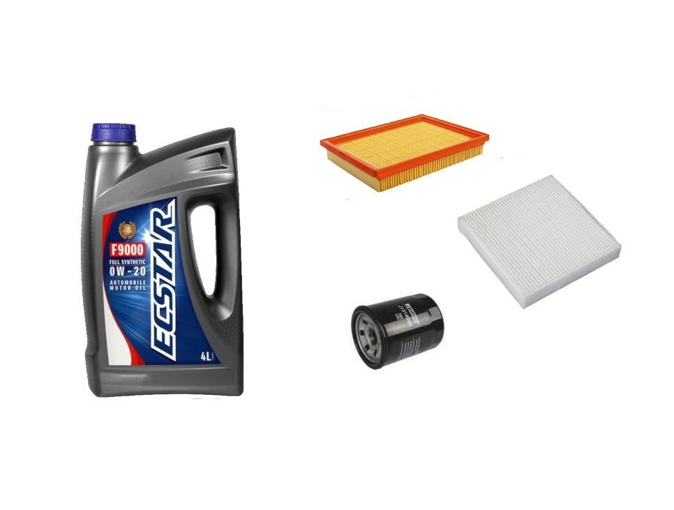 Suzuki Swift olajcsere szett 1.3-1.5 benzin 2005-2010 levegőszűrő, olajszűrő, pollenszűrő, Suzuki gyári motorolaj ECSTAR 0w20 4L (99000-21E20-047, 13780-62J00, 16510-61A01, 95860-62J00)